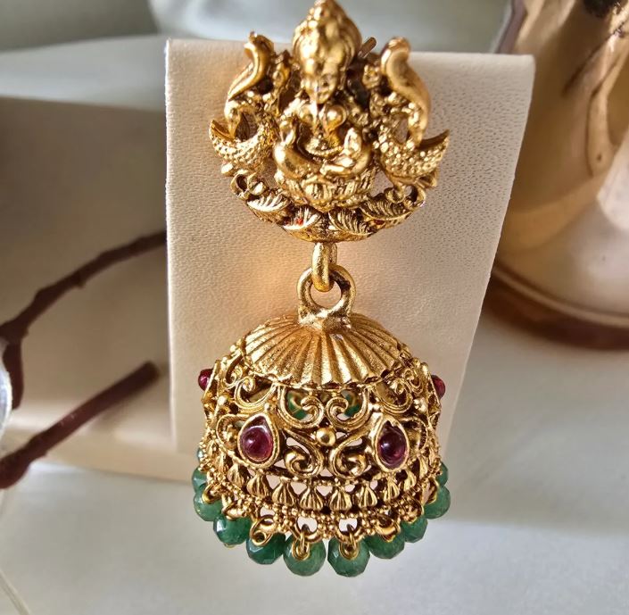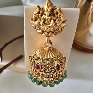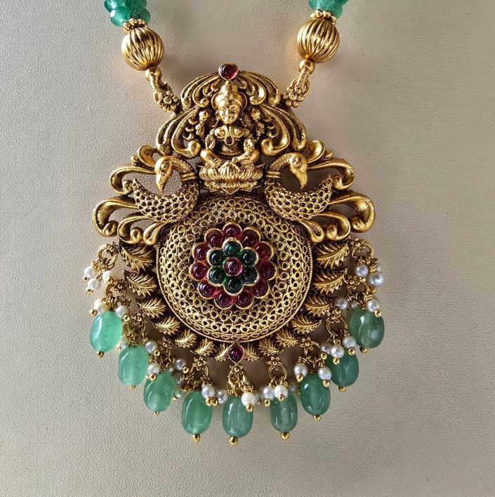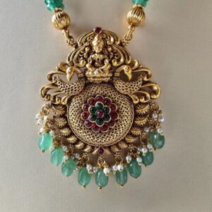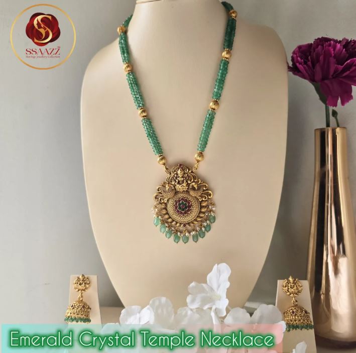 Necklace, layered and adorned with emerald crystal beads along with Temple motifs, Nagas , Deities, floral patterns & Kemp stones.