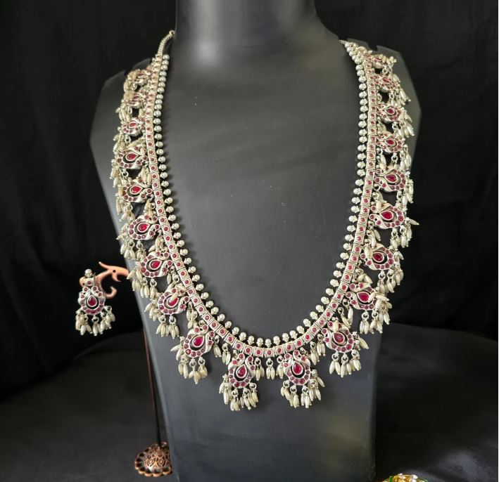 This jewelry style is known for its elaborate and intricate design, featuring numerous small beads, often pearls, arranged in a clustered manner.