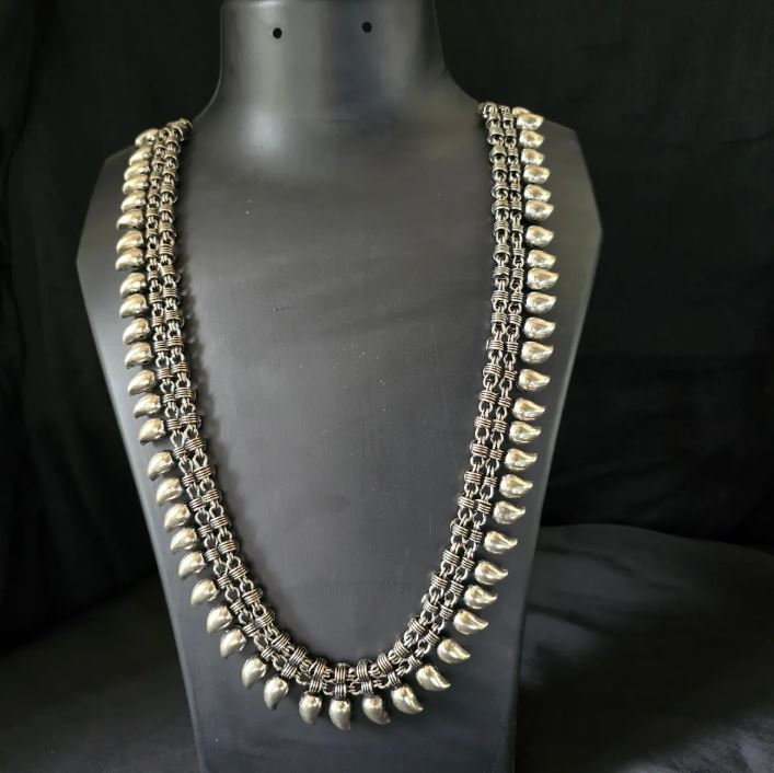 A heavy necklace, Manga Mala featuring Mango-shaped motifs. It is one of the most cherished jewellery pieces.