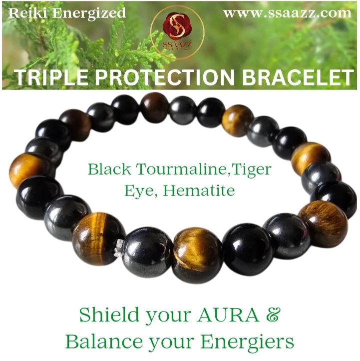 SSAAZZ Reiki-Energized Crystal : Triple Protection Bracelet (8mm Beads, AAA Quality)